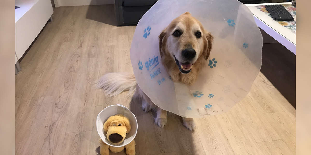 Sick Dog Wearing Cone Of Shame Gets A Friend Who's Wearing